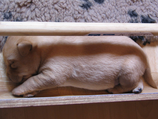 nach der Allgemeinuntersuchung die erste "Komplettimpfung" (ohne Tollwutimpfstoff) gegen Staupe, Hepatitis, Parvovirose, Leptospirose und Zwingerhusten. Anschließend wurde jedem Kleinen mit einer Kanüle ein Mikrochip mit einer individuellen Chipnummer unter die Haut gesetzt. Mit einem speziellen Lesegerät ist hierdurch jeder Hund leicht und eindeutig zu identifizieren. Die Kleinen konnten während der ganzen Zeit wieder frei im Untersuchungszimmer umherlaufen und alles inspizieren und wurden nur kurz für die 'Behandlung' auf den Untersuchungstisch gehoben. Im Auto schliefen die Kleinen aneinandergekuschelt im Kennel - somit war auch dieser Ausflug mit positiven Eindrücken gut verlaufen.