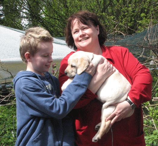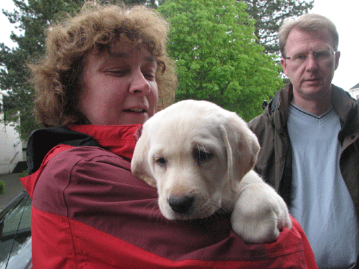 Alle Welpenkäufer sind total aufgeregt zum Übergabezeitpunkt bei uns erschienen und konnten teilweise die vergangene Nacht nicht schlafen. Alle haben voller Vorfreude dem Termin entgegengefiebert. Die Wartezeit wurde mit dem Studieren von Fachlektüre, Zäune ziehen, Fliesen legen, Wohnung umgestalten, Einkauf von Welpenutensilien etc. überbrückt, aber nun sind die Vorbereitungen abgeschlossen und es kann mit dem Abenteuer "ein Welpe zieht bei uns ein" losgehen. Während noch die restlichen Formalitäten erledigt werden und dabei eine Tasse Kaffee getrunken wird, spielt Tracy instinktiv das letzte Mal genau mit dem Welpen, der nun den Besitzer wechselt und nimmt von ihm Abschied. Für uns ist dies ein sehr ergreifender Moment. Dann ist es soweit und der Kleine wird in die Arme der neuen Familie übergeben. Für die Autofahrt und die ersten Tage zuhause kommt noch eine Decke mit, die einige Zeit in Tracy's Körbchen gelegen hatte. Somit erschnuppert der Welpe auch in der neuen Umgebung etwas Gewohntes.