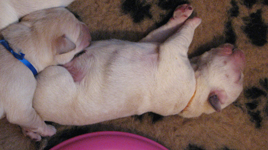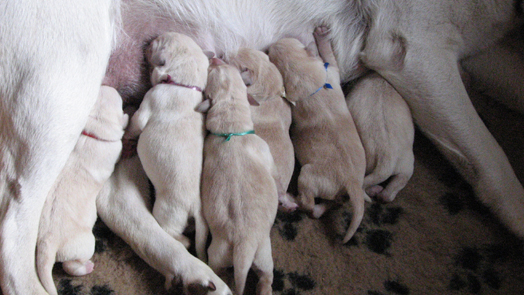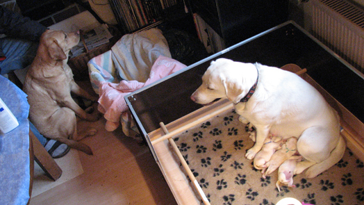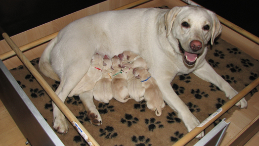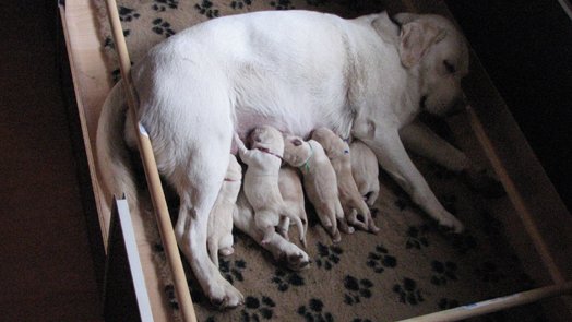Tracy hat die gesamte Geburt eigenständig gemeistert und alles verlief ohne jegliche Komplikation. Auch der Milchfluß war sofort da, so dass die Kleinen durch das Trinken der Kolostralmilch bereits ihre erste "Impfung" erhalten haben. Tracy kümmert sich seitdem rührend um die Kleinen und bewegt sich keine Minute von ihnen weg. Wir müssen Tracy mit einem Trick überreden, dass sie sich wenigstens mal draußen in unserem Garten erleichtert: wir legen die Kleinen in einen Korb auf eine Wärmflasche und tragen sie - mit einem Handtuch zugedeckt - nach draußen, damit Tracy uns dorthin folgt. Nach der Notdurft geht es mit schnellen Schritten direkt wieder zurück zur Wurfkiste, die in der Zwischenzeit schnell gesäubert und mit neuer Unterlage ausgestattet wurde.