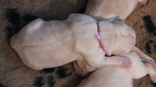 Nachdem die Eröffnungswehen in der Nacht vom 28. auf den 29. Februar begonnen hatten, dauerte es bis zum nächsten Mittag, bis Tracy durch ein paar kurze Preßwehen den ersten Rüden um 14:15 Uhr geboren hat. Sie kam noch gerade dazu, die Fruchthülle zu öffnen und die Nachgeburt zu verzehren, als bereits acht Minuten später eine Hündin das Licht der Welt erblickte. Danach ging es in zeitlich etwas größeren Abständen weiter mit der Geburt, bis um 19:40 Uhr der letzte Rüde durch einen ersten Schrei die Welt begrüßte.